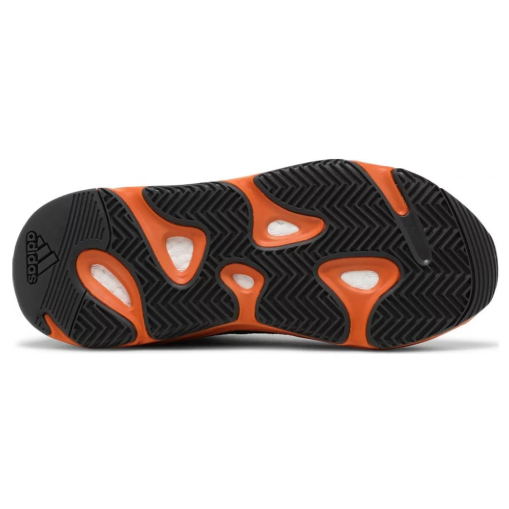 The adidas Yeezy Boost 700 ‘Bright Blue’ features royal blue mesh with suede overlays at the toe and heel, and black suede midfoot panels with reflective detailing. The sculpted orange sidewalls are paired with a black rubber outsole, featuring a herringbone traction pattern and cut-out detailing that reveals a drop-in Boost midsole.