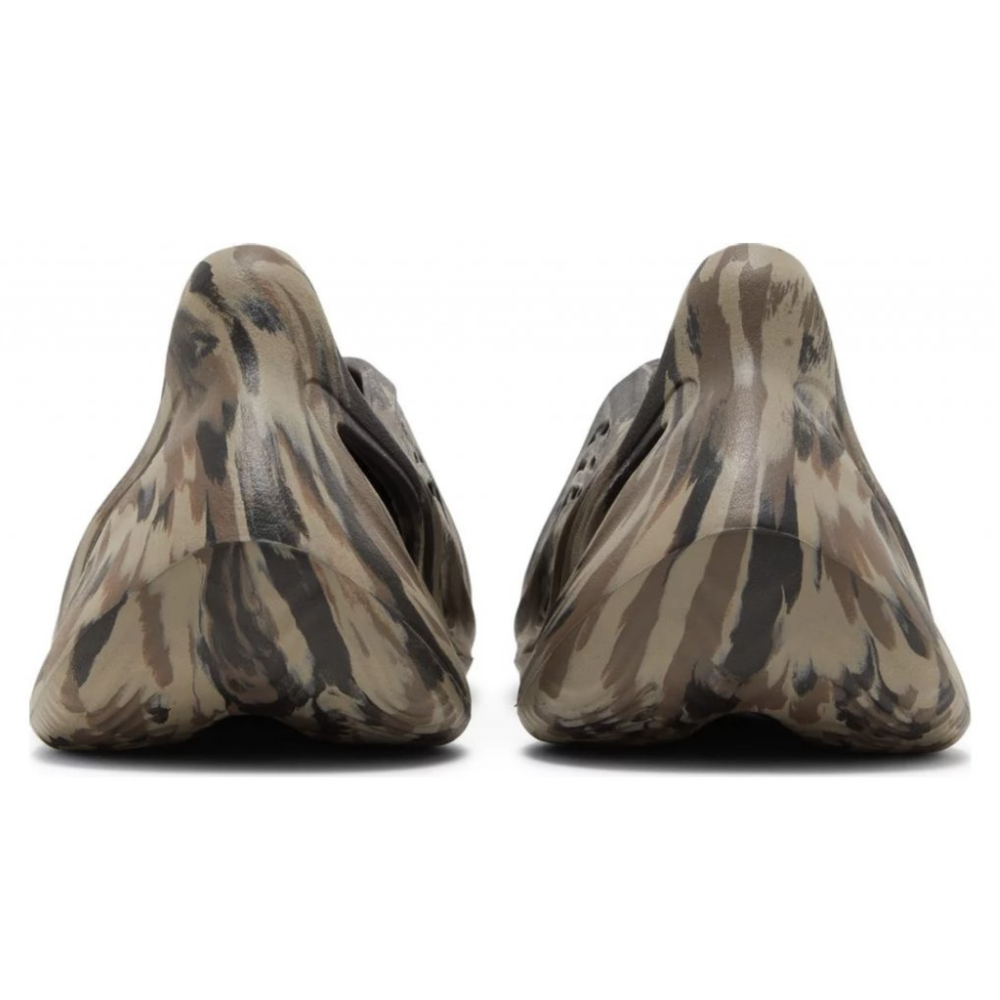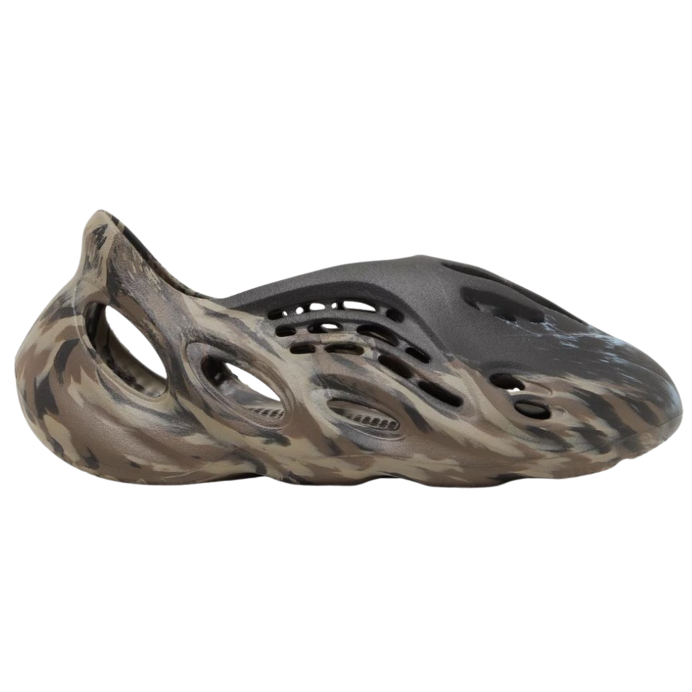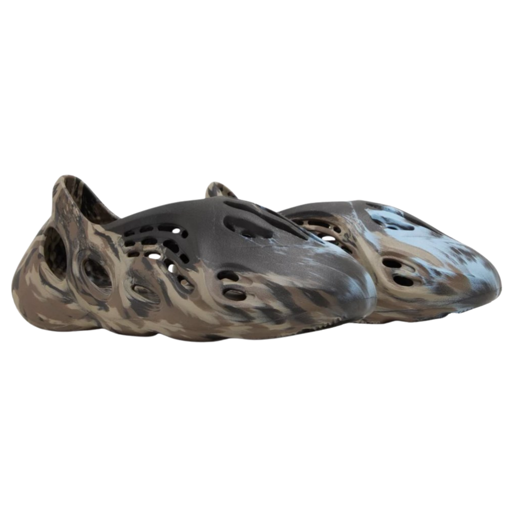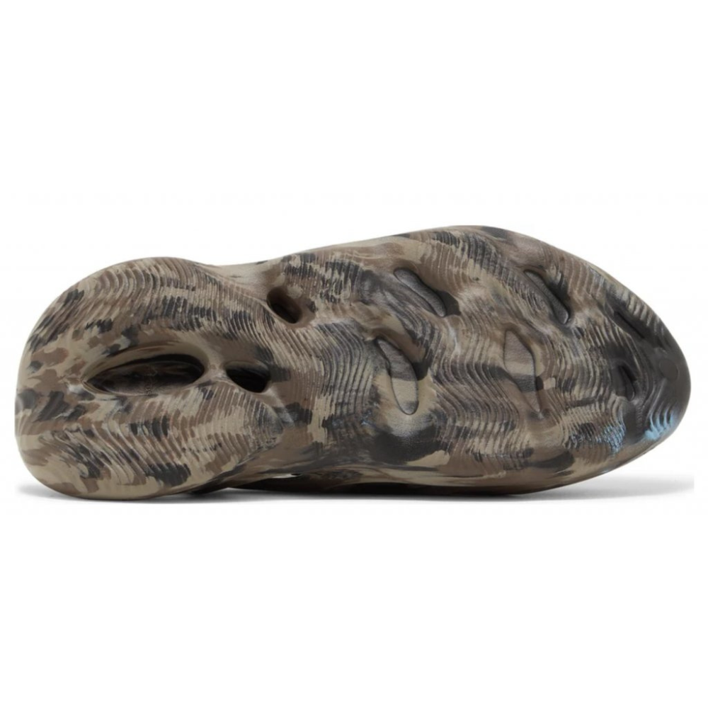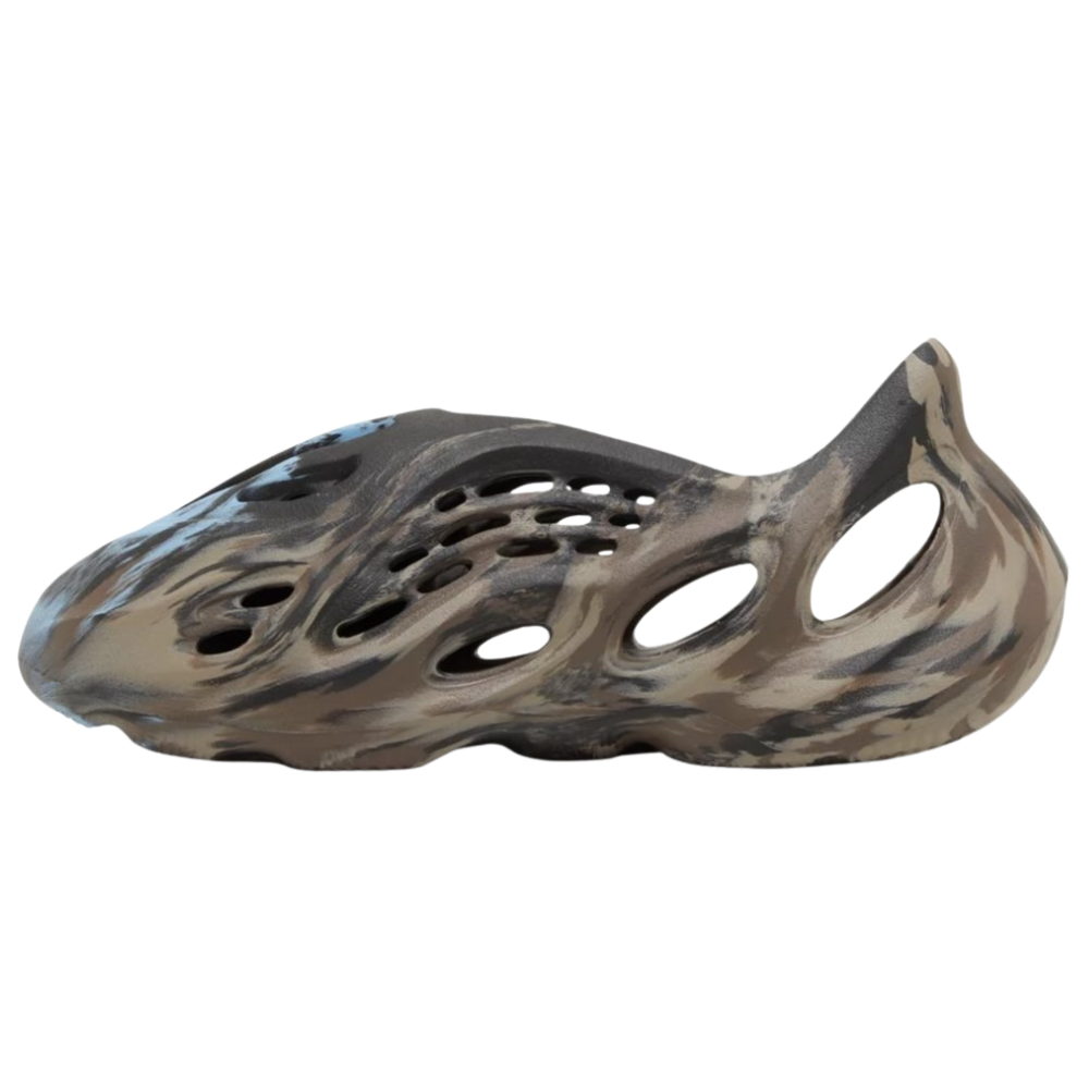 The adidas Yeezy Foam Runner ‘MX Cinder’ features a one-piece EVA foam construction in brown and tan shades, accented with aqua blue bursts. Strategically placed vents enhance breathability, while the soft footbed offers comfort. The contoured outsole with a wavy tread provides optimal grip.