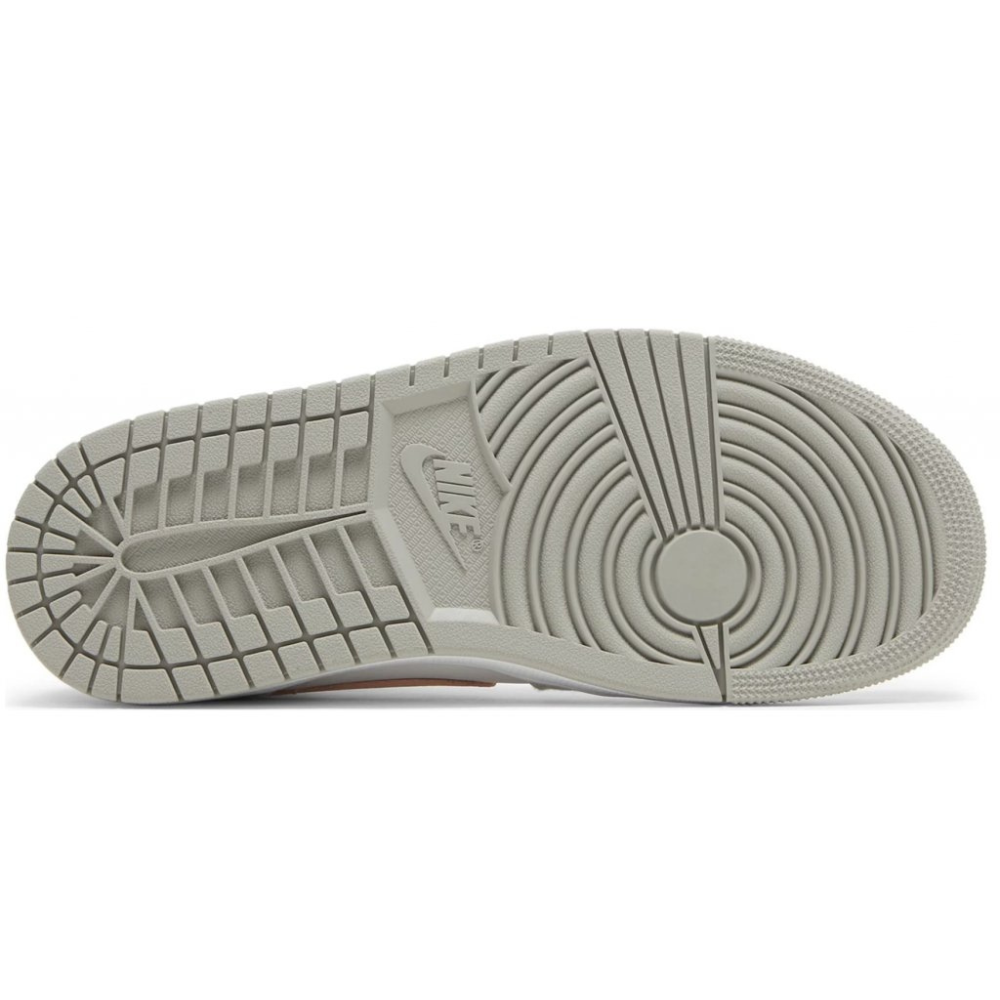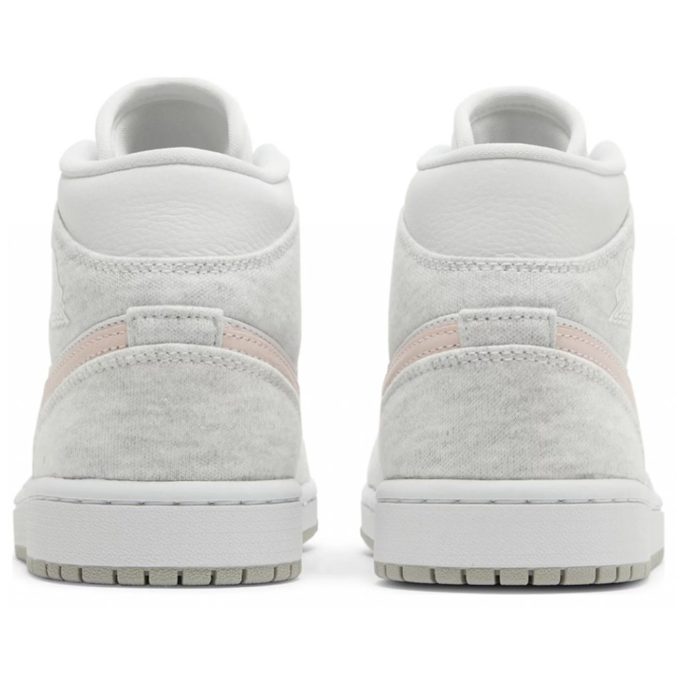 Air Jordan 1 Mid SE Light Iron Ore features white laces and a white tongue, with the Air Jordan symbol in grey at the top. The sneaker has a light grey outsole and a bright white midsole. The rest of the upper is made from a mixture of pebbled leather and canvas-like fabric. Grey canvas panels are carefully placed on the sides, surrounding the pink leather Nike Swoosh symbol.