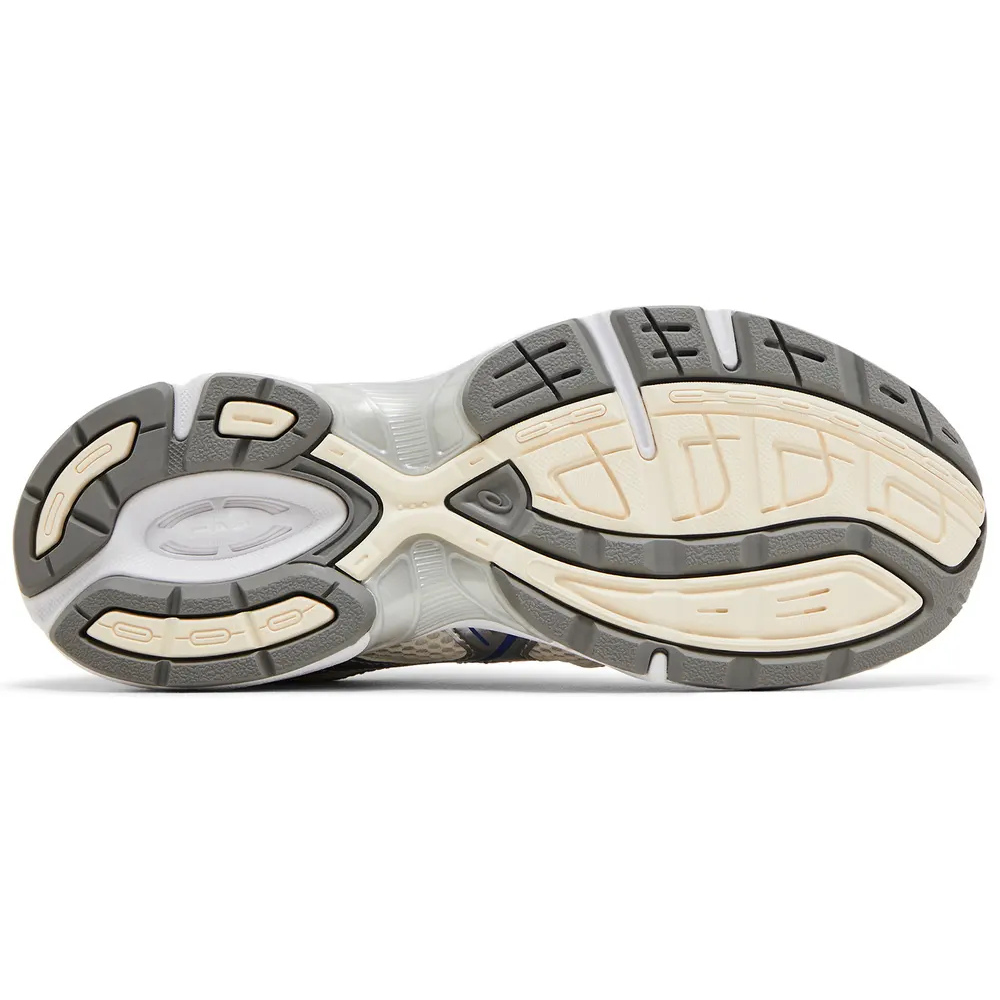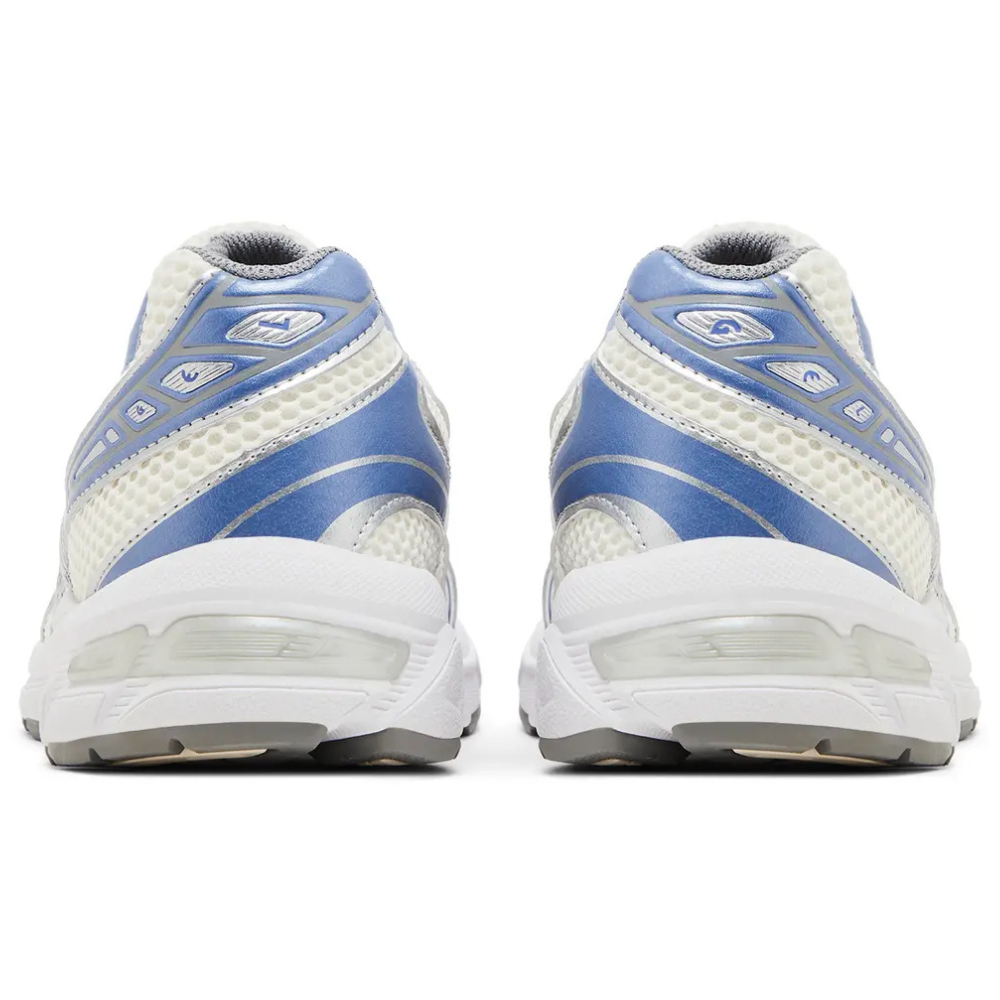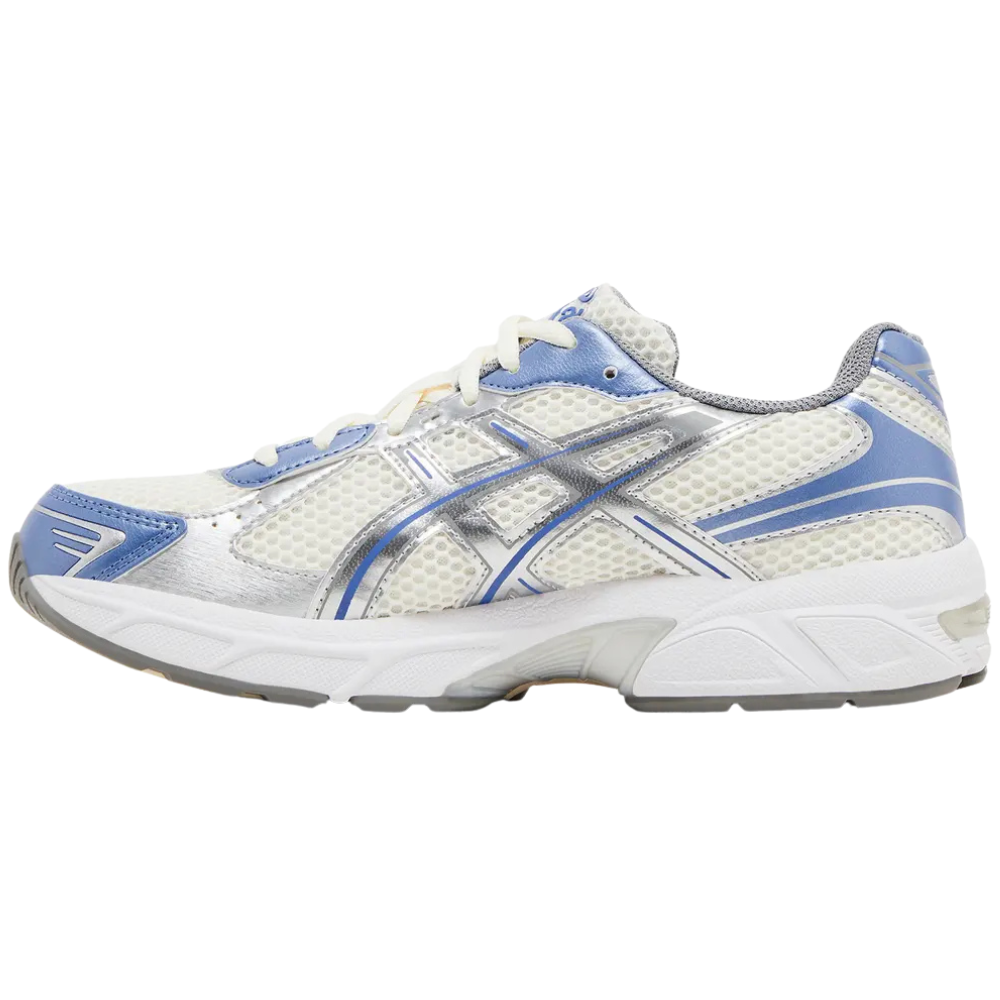 The ASICS Gel 1130 Cream Blueberry features a white mesh upper with metallic silver tiger stripes, reinforced with blue synthetic leather on the eyestay, toe, and midfoot overlays. Branding appears on the tongue and sockliner. Comfort comes from a lightweight EVA midsole with a visible Gel heel insert, while a durable rubber outsole with ASICS’ TRUSSTIC system provides midfoot stability.