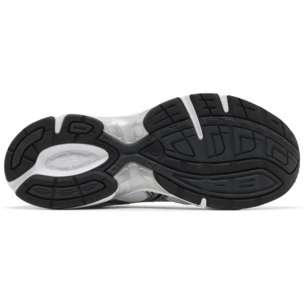 The ASICS Gel 1130 White Pure Silver Black combines white mesh with synthetic leather overlays, featuring metallic silver tiger stripes. Cushioning comes from an EVA midsole with visible Gel inserts in the heel, while a durable rubber outsole and TRUSSTIC system provide stability and support.