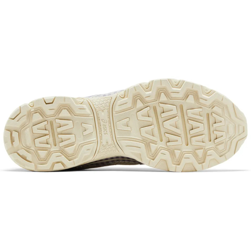 The ASICS Gel-Venture 6 Story mfg. Vanilla Violet Quartz Gingham blends trail-ready GEL cushioning with a stylish gingham upper in vanilla and violet tones. The shoe features a breathable mesh base layered with soft gingham fabric and transparent TPU accents. A padded collar supports the ankle, while six-eyelet laces secure the fit. Comfort and shock absorption come from GEL cushioning in the heel, complemented by a durable, high‑traction rubber outsole.