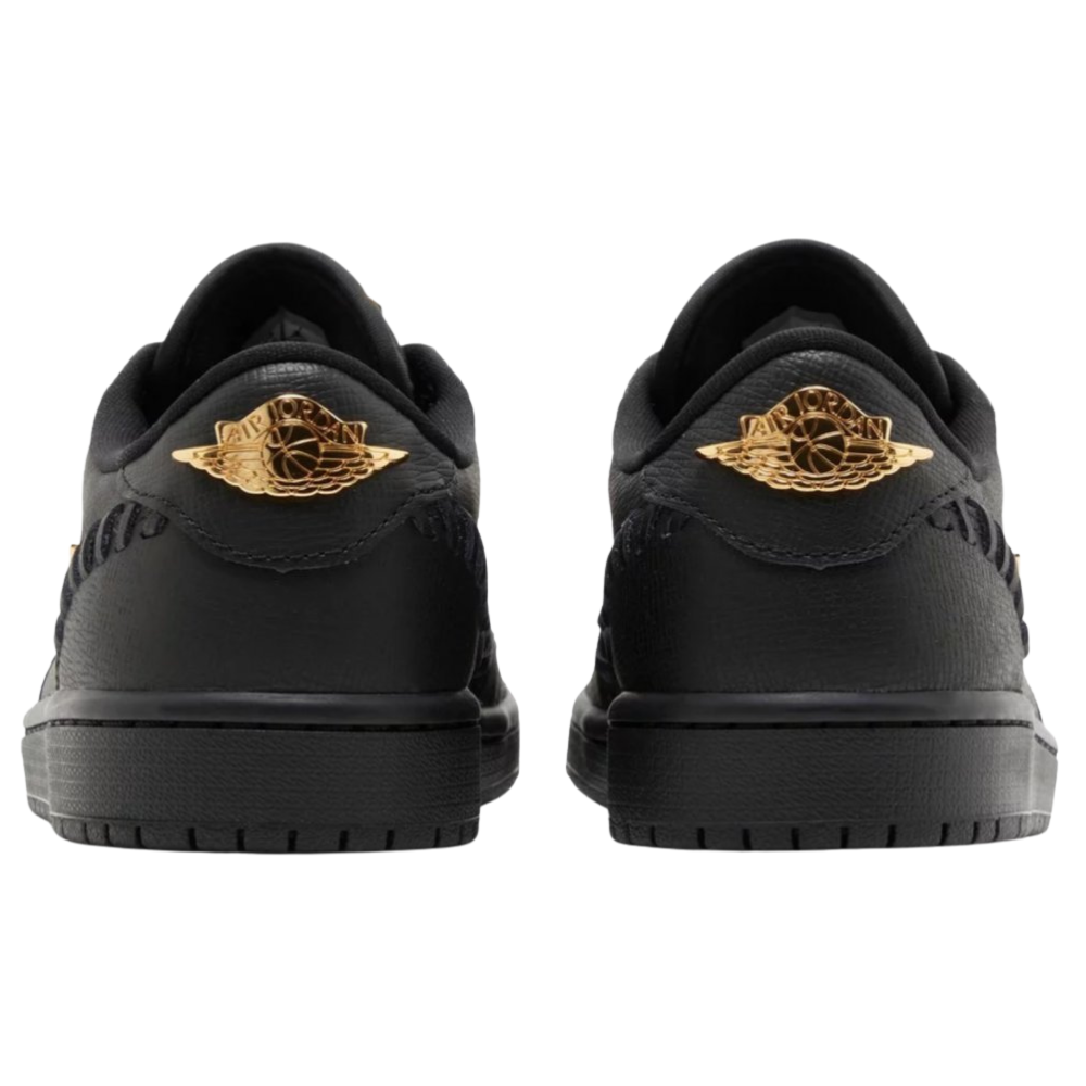 The Air Jordan 1 Low Method of Make 'Black' feature a black leather upper, updated with oversized stitch detailing at the forefoot and heel. A metallic gold Swoosh adorns the quarter panel, matching the molded Wings logo on the heel tab and an 'Air Jordan' nameplate on the tongue. A pink rubber cupsole packs an Air-sole heel unit encapsulated in a polyurethane wedge.