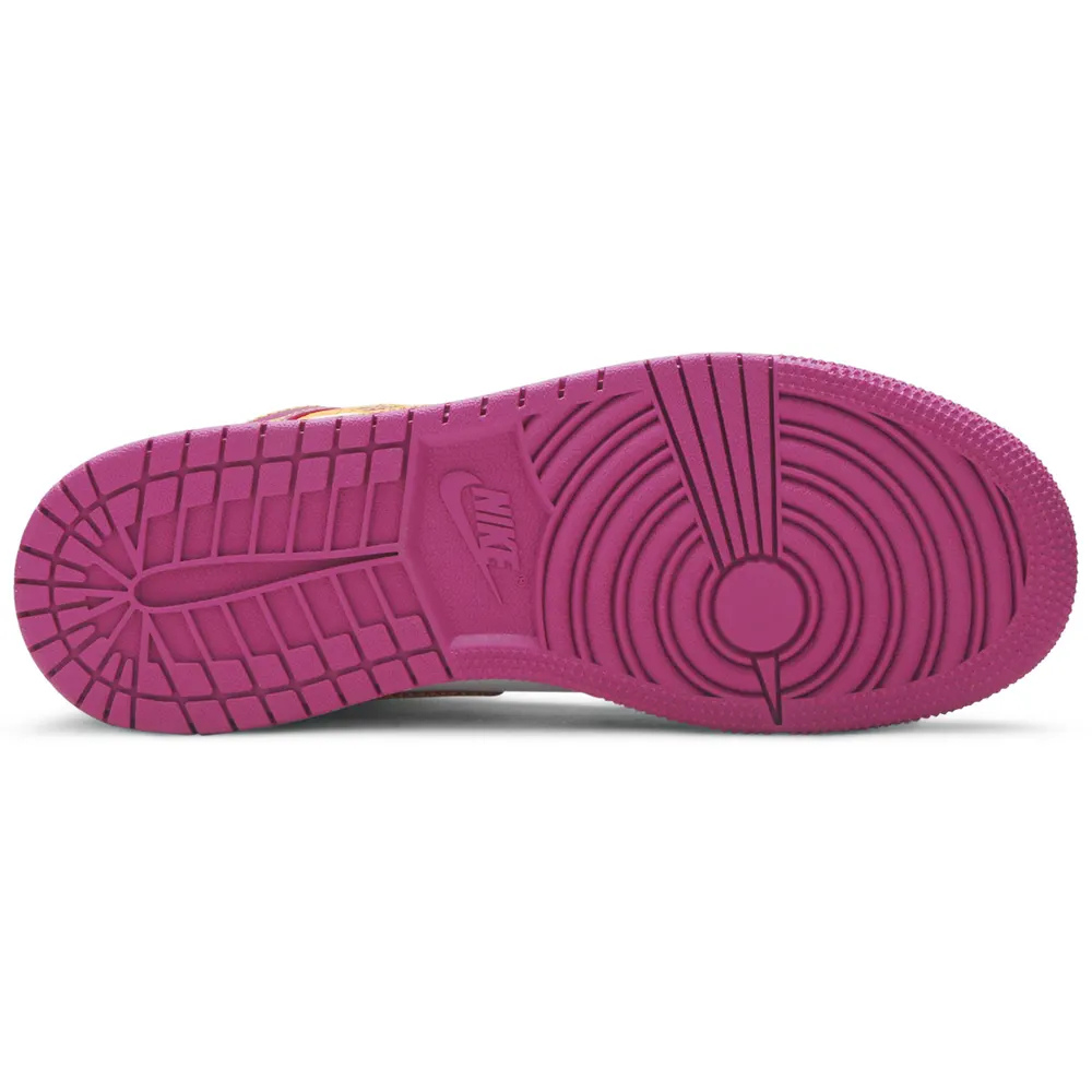 The Air Jordan 1 Mid Familia GS, part of Nike’s Day of the Dead collection, honors the Dia de Los Muertos holiday, celebrating family and the journey of life after death. The sneaker features a bold color palette with University Gold and Cactus Flower fuchsia. The left shoe shows "familia" in gold, the right shoe "para mi," meaning "family" and "for me." The iconic Air Jordan logo is near the ankle, and the Swoosh is gold with contrast fuchsia stitching. The model combines classic Air Jordan materials with a modern touch, honoring Mexican culture.