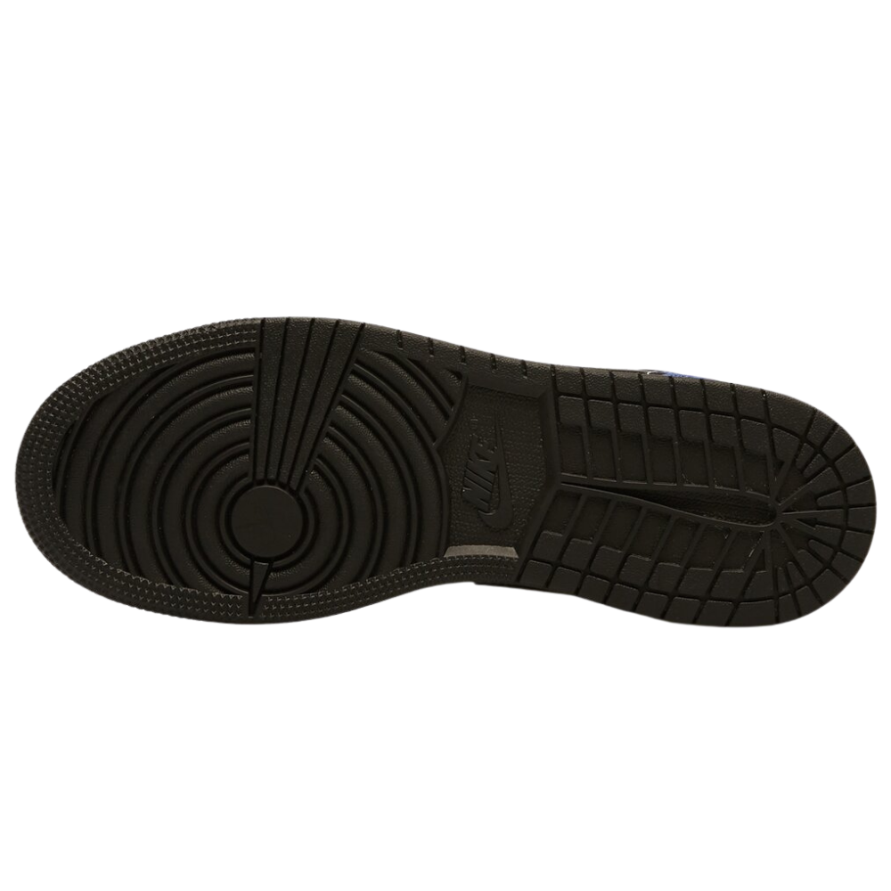 The Game Royal Jordan 1 Mid (GS) features vivid Game Royal overlays on a white leather base, complemented by a black leather Swoosh. The sneaker sits on a white midsole and a matching Game Royal rubber outsole. The upper includes smooth Game Royal overlays on the eyestays, heel, and ankle collar, with a perforated toe box for ventilation. The midsole is equipped with Air cushioning in a white foam unit, and the rubber outsole in Game Royal offers traction inspired by the original AJ 1 design. Flat white laces and a woven Jumpman tongue label complete the look.
