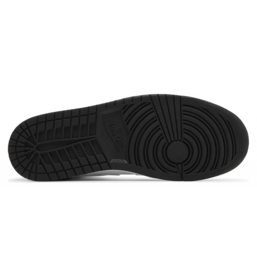 The Air Jordan 1 Mid 'Green Glow' features a white leather base with contrasting black leather overlays, giving it a sharp, modern look. The standout detail is the vibrant 'Green Glow' accents on the Swoosh, Wings logo, tongue, and insole, which add a bold pop of color. With a white midsole and black rubber outsole, this sneaker offers both style and comfort, making it a versatile choice for any collection.