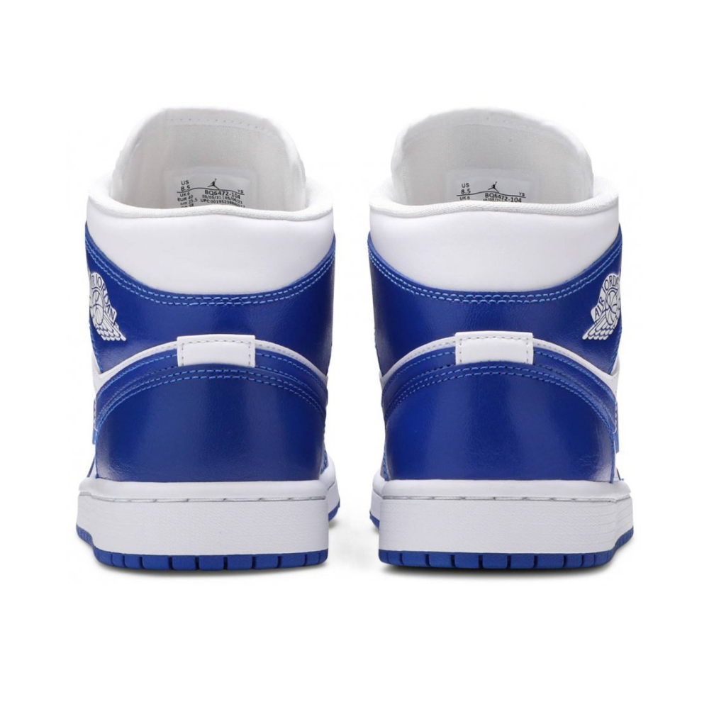 Jordan 1 Mid Kentucky Blue boasts a full leather upper comprised of white leather and Royal Blue leather overlays. The white leather covers the toes, ankles, and sides. The iconic colorway also features Nike Swoosh logos on the sides, the legendary Jumpman logo on its royal blue tongue, a white rubber midsole, and a royal blue outsole hardened to improve the sneaker’s durability.