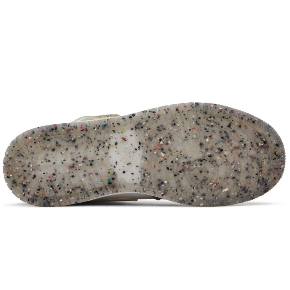 Air Jordan 1 Mid Pastel Grind (GS) features a sole with a thin strip of transparent plastic containing sparkles, topped with a white strip. The upper is made of various types of canvas, including patches of white, pink, yellow, and gold. The Air Jordan 1 Mid Pastel Grind (GS) is a high-top model, designed to reach the top of the average wearer’s ankle.