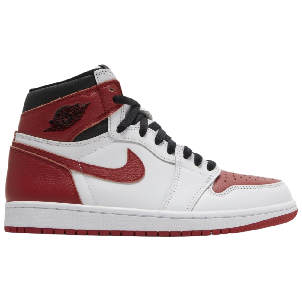 The Air Jordan 1 Retro High OG Heritage showcases a familiar color scheme rooted in the history of the Jordan franchise. The white leather upper features contrasting hits of University Red on the toe box, Swoosh, heel, and ankle flap. The latter is stamped with a retro Wings logo in black, matching the laces and high-cut padded collar. Nike Air branding decorates the woven tongue tag. The sneaker sits atop a rubber cupsole with encapsulated Air-sole cushioning in the heel.