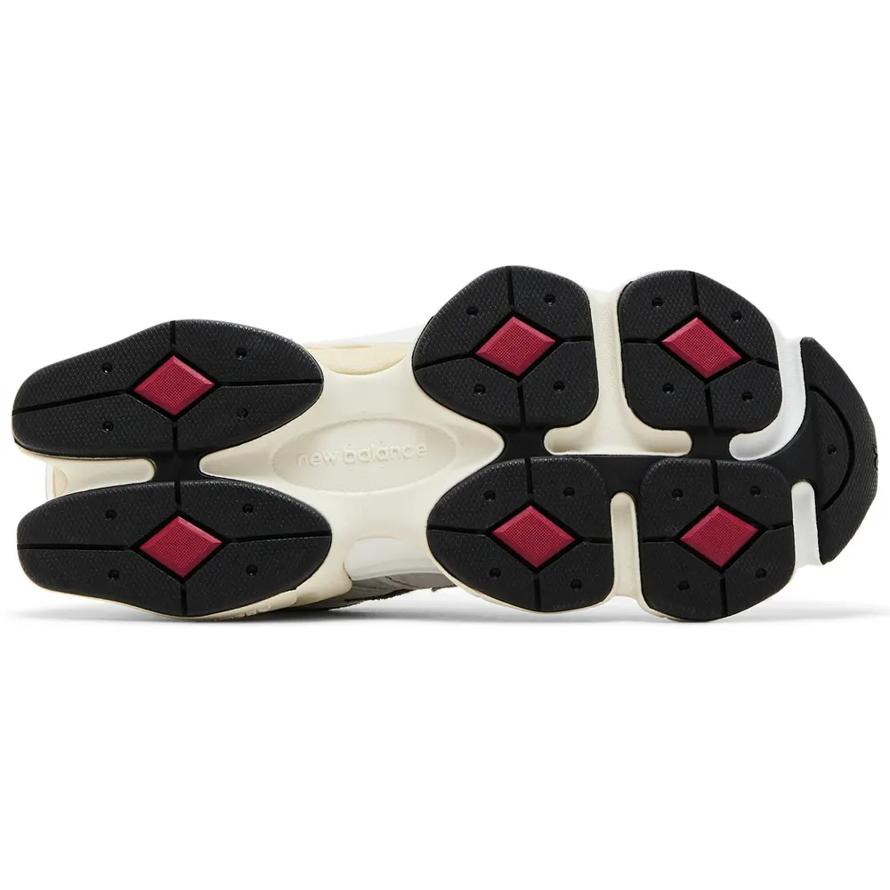 New Balance 9060 Raincloud features varying shades of grey across the upper, crafted from ventilated mesh with arcing suede and synthetic leather overlays. A jeweled NB 9060 badge in bold crimson on the tongue disrupts the greyscale palette. The sneaker rests on an exaggerated ABZORB midsole with SBS cushioning in the heel, while the black rubber outsole with a diamond pattern, inspired by the classic 860, delivers durable traction.