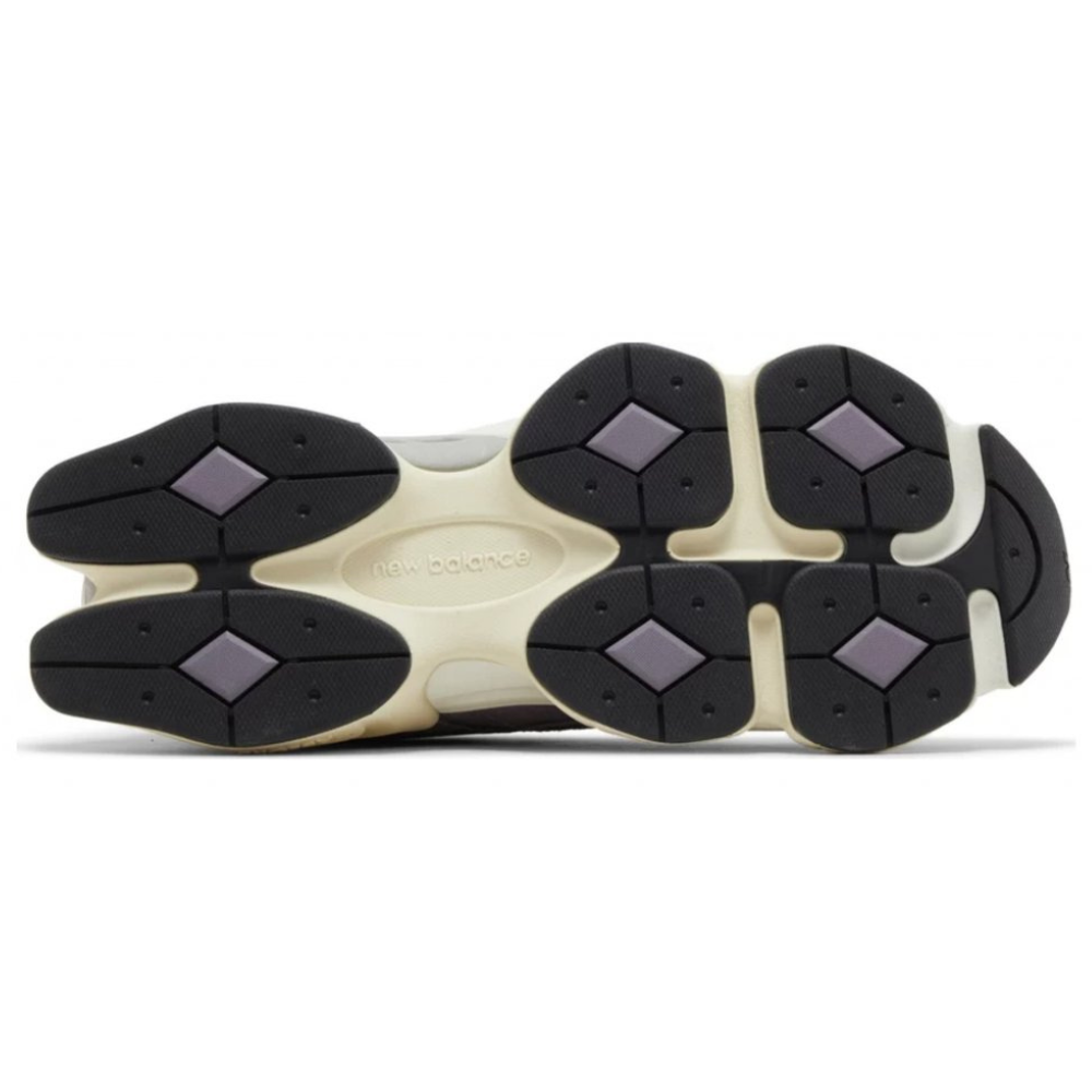 The New Balance 9060 Shadow combines purple suede panels with a slate blue mesh upper. A silver 'N' logo decorates the lateral side, while a jeweled NB 9060 emblem sits on the tongue. The stacked dual-density midsole with ABZORB and SBS cushioning ensures comfort, and a diamond-patterned rubber outsole provides durable traction.
