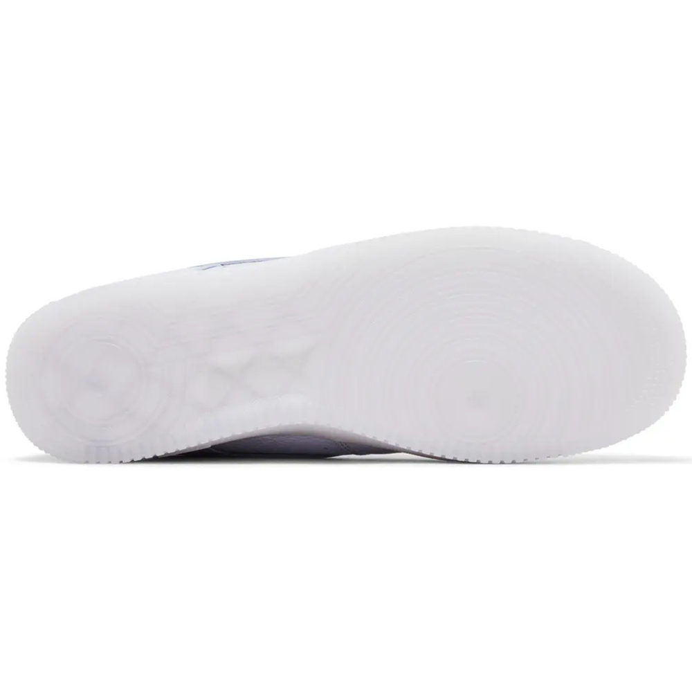 NOCTA x Nike Air Force 1 Low Certified Lover Boy Palest Purple is made of premium tumbled leather in a muted violet shade. Tongue has tonal Nike Air branding, left heel shows NOCTA North Star logo. Semi-translucent rubber cupsole with Love You Forever on the side, outsole has embossed hearts instead of stars.