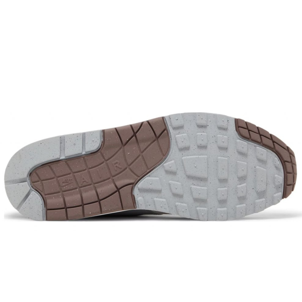 The Nike Air Max 1 Premium Shima Shima 2023 is part of the Japanese-inspired sneaker line, arriving in a Summit White/Plum Eclipse-Wolf Grey-White Siren Red colorway. The tongue tag showcases "Shima Shima" in Japanese, and the inner lining is adorned with a distinctive striped pattern. The white midsole features a visible Air unit in the heel, while the rubber outsole combines gray and brown shades. The upper is constructed from all-premium leather with gray quarter panels over a white base, while the Swooshes and mudguard appear in dark brown. The base features Plum Eclipse, and the Nike Air branding appears on the mudguards, Swooshes, and laces.