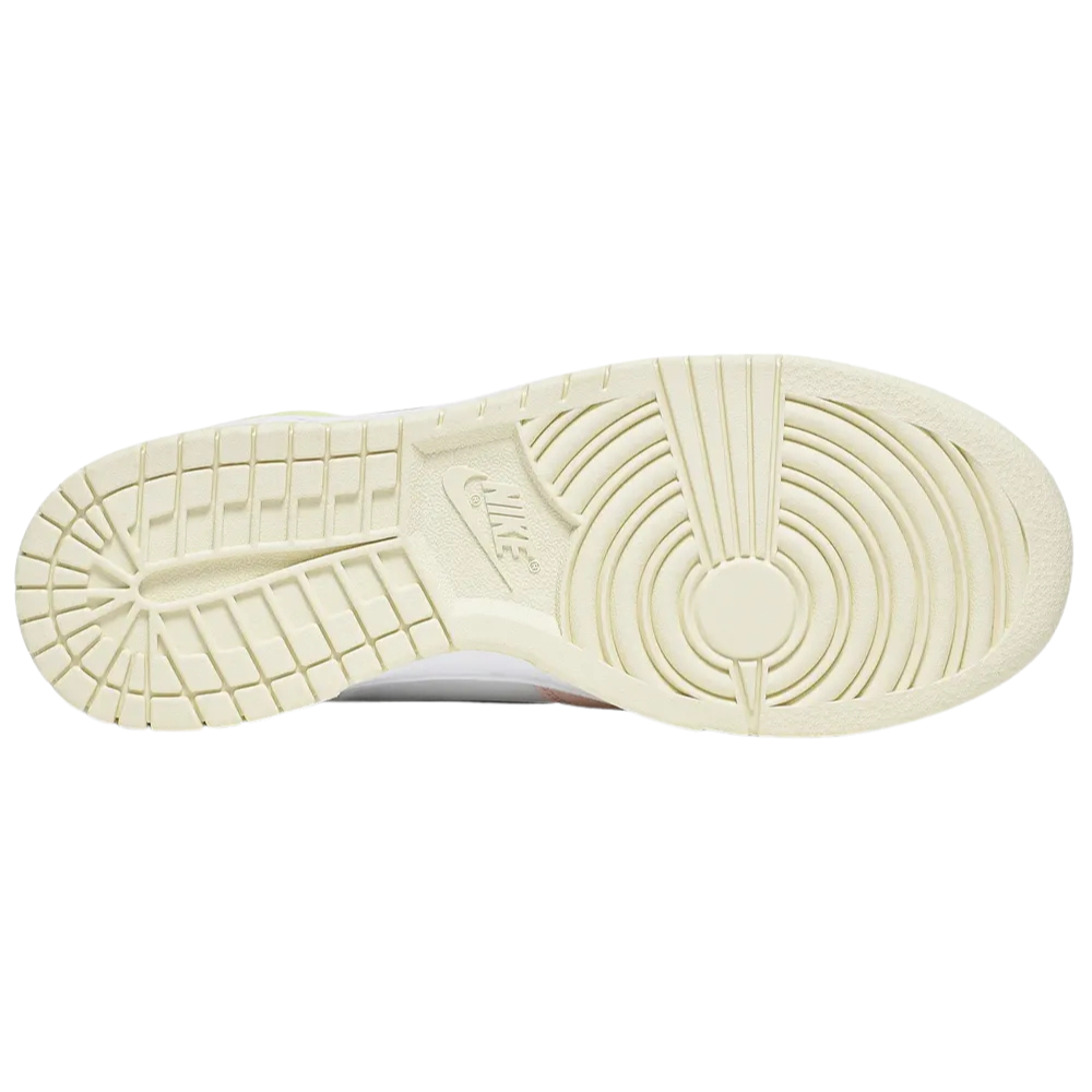 The Nike Dunk High Cashmere gives the classic high-top a pastel summer update. White leather forms the base, accented by a pink forefoot, lavender eyestays, and a bright yellow heel. The signature Swoosh appears in neutral cream. Standard Nike branding is featured on the sockliner and woven tongue tag. The rubber cupsole completes the look with a durable, grippy tread.