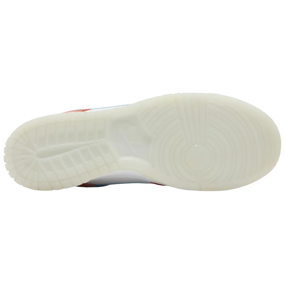 The LeBron James x Fruity Pebbles x Nike Dunk Low celebrates the iconic cereal loved by the NBA superstar. The smooth leather upper features a white base with scarlet overlays and a powder blue Swoosh, secured with multicolor laces. A woven Fruity Pebbles tag adorns the tongue, while LeBron’s LJ logo is embroidered on the heel tab. Inside, the Nike-branded sockliner showcases a Fruity Pebbles graphic print. The shoe rests on a milky translucent rubber outsole for reliable traction.