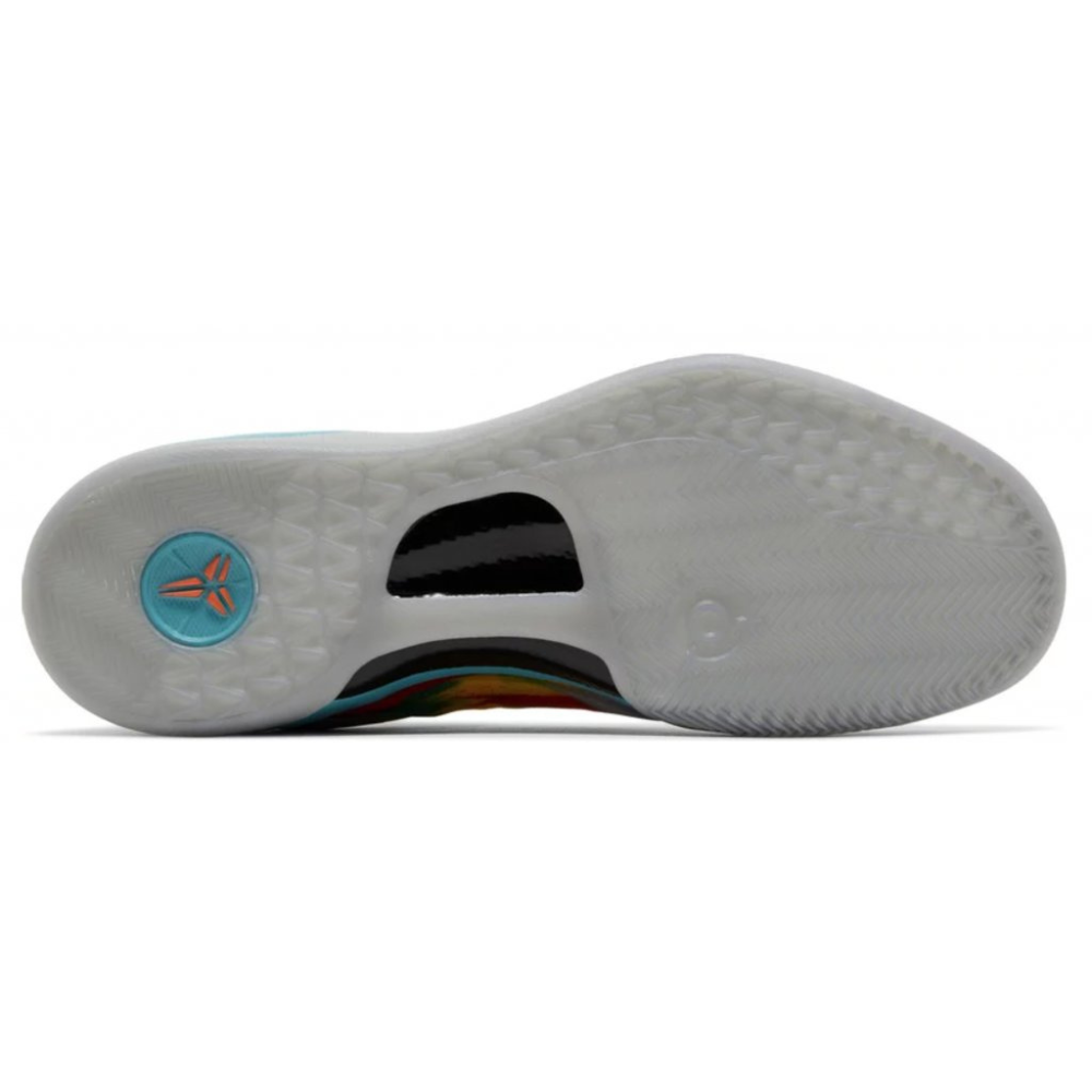 Nike Kobe 8 Protro Venice Beach 2024 celebrates the vibrant culture of the Los Angeles neighborhood. A grey engineered mesh upper is enlivened with splashes of red, teal, and yellow, complemented by a turquoise external heel counter and orange textile collar lining. Performance features include a drop-in React foam midsole and a carbon fiber shank plate, while a semi-translucent rubber outsole with herringbone pattern delivers superior traction.