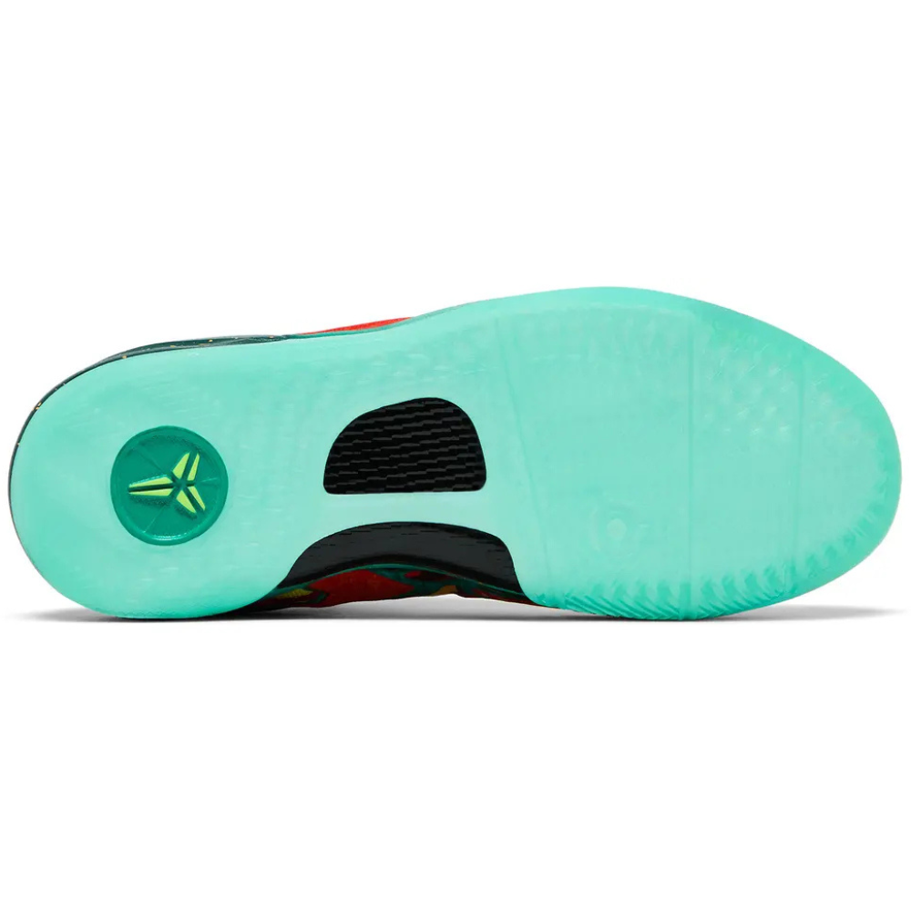 Nike Kobe 8 Protro What The Kobe brings back a greatest-hits colorway originally released in 2013, featuring a mix of details from past Kobe 8 editions. The right shoe has a red snakeskin print mesh upper, accented with a yellow Swoosh and lime green textile lining. The left shoe features a blue snakeskin print and a lateral crimson Swoosh, matching the textile collar lining. A reflective oversized Nike wordmark decorates the medial side. The low-top sits on an updated Cushlon midsole with a springy Zoom Air unit in the forefoot.