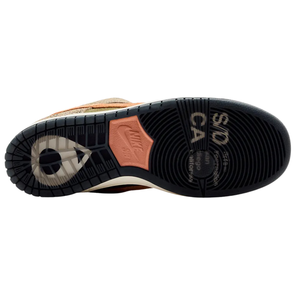 The Arts-Rec x Nike Dunk Low SB ‘For Recreational Use’ is inspired by the San Diego Zoo. The mixed-material upper pairs green nubuck quarter panels with leopard-print leather overlays at the toe and heel, plus pink leather on the collar and toe box. An orange suede Swoosh adds contrast, while branding includes a Nike SB tongue tag and ‘Arts’ and ‘Rec’ stamped on the heel tabs. A dark grey translucent outsole reveals printed text reading ‘Arts-Recreation San Diego California.’