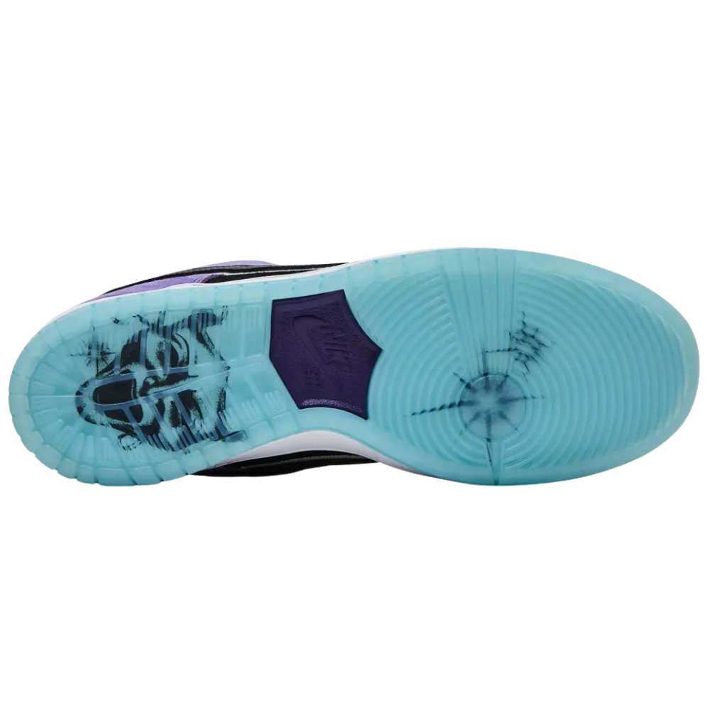 The Hayley Wilson x Nike Dunk Low SB Court Purple marks the Australian skater’s first signature colorway. The upper pairs black suede quarters with Court Purple suede overlays on the forefoot and heel, complemented by a white leather toe box and a black leather Swoosh outlined in white. Lagoon Pulse highlights appear on the co-branded tongue tag and suede heel tab with gothic Nike lettering. A translucent blue rubber outsole reveals custom graphics beneath.