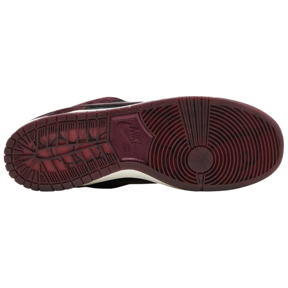 The RIOT Skateshop x Nike Dunk Low Pro SB QS Mahogany Dark Beetroot delivers a collaborative design inspired by Bordeaux, France. The upper pairs a dark green nubuck base with port-colored suede overlays on the forefoot and heel. A matte burgundy Swoosh outlined in glossy TPU adds contrast, while RIOT Skateshop tongue tags and the reclining dog logo on the lateral heel offer unique branding. Mismatched RIOT and Nike logos appear on the nubuck back tabs and cork insole. The maroon translucent rubber outsole provides durable traction.