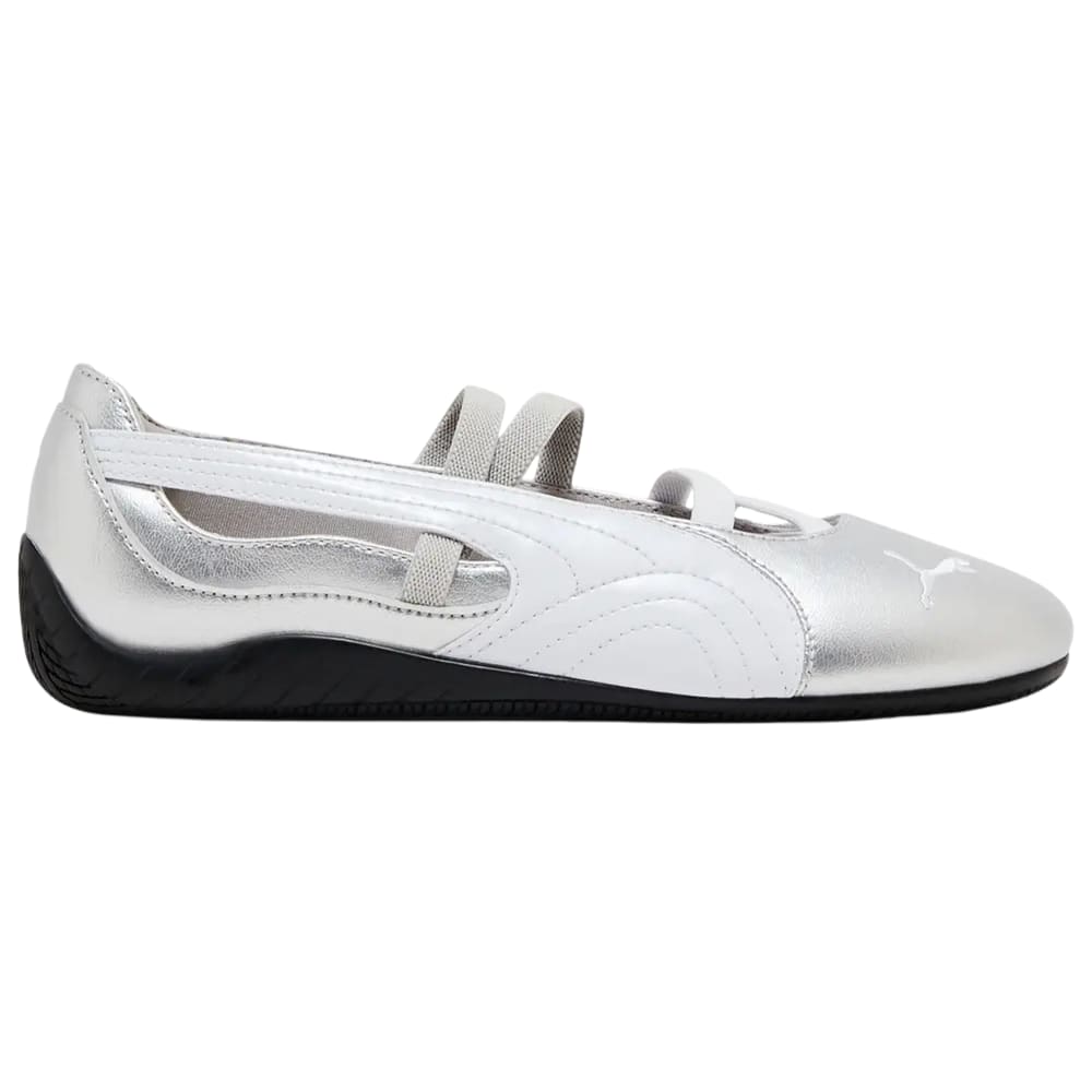 The Puma Speedcat Ballet Silver presents a low‑profile metallic silver upper with signature Formstrip, elastic instep bands, and embroidered PUMA cat logo, white accents, seated on a lightweight rubber outsole for traction.