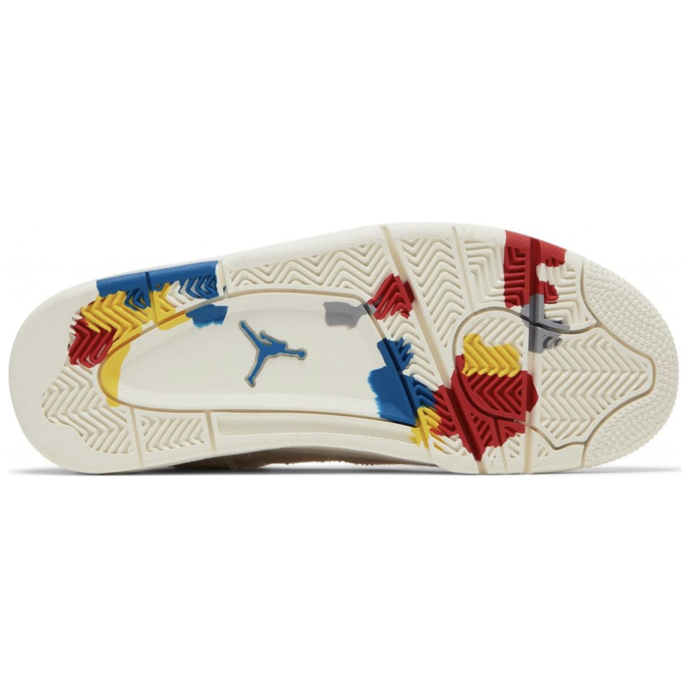 Air Jordan 4 Retro Blank Canvas predstavuje nefarbený dizajn pripravený na prispôsobenie. Vrstvený zvršok je vyrobený z takmer bieleho plátna s neopracovanými okrajmi a tónovým prešívaním. Tvarované očká na zipsy a vyšívané logo Jumpman na jazyku a päte zachovávajú jednotný vzhľad topánky. Medzipodrážka z polyuretánu v slonovinovej farbe obsahuje viditeľnú jednotku Air-sole v päte pre ľahké odpruženie. Pod nohami je gumená podrážka s priľnavosťou v rybej kosti zvýraznená viacfarebnými prvkami farby.