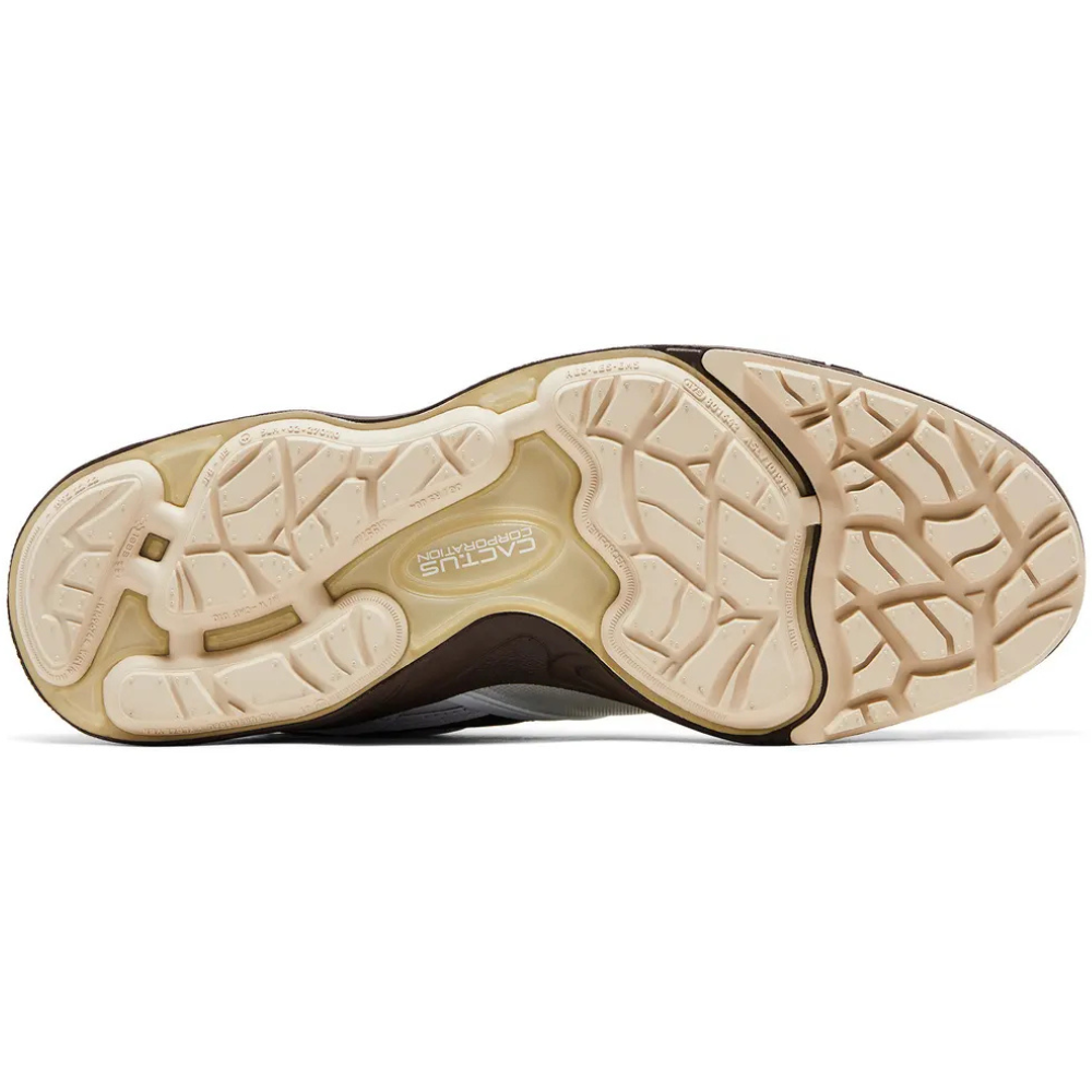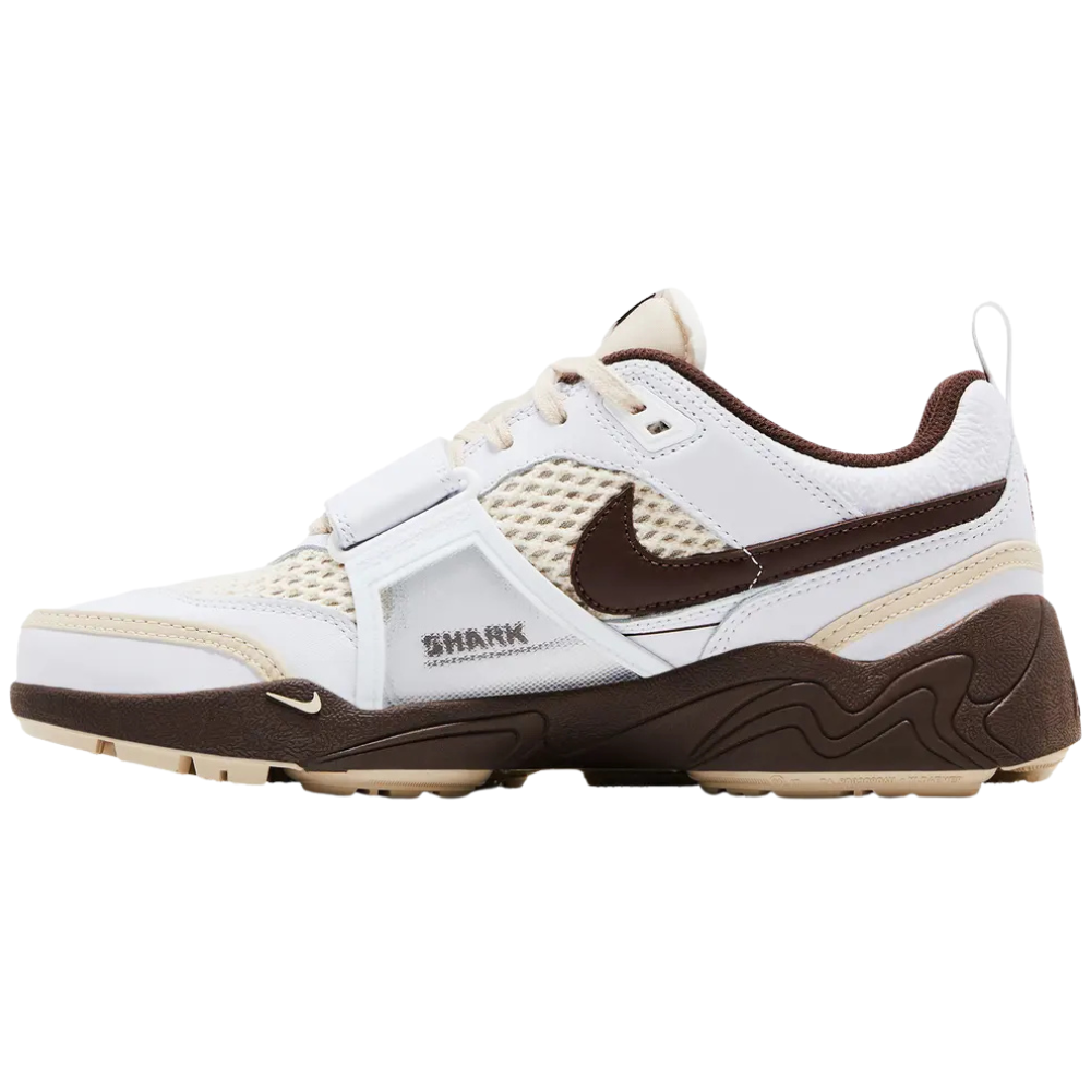 Travis Scott x Nike Zoom Field Jaxx Light Chocolate predstavuje jedinečnú spoluprácu s rapperom Travisom Scottom. Zvršok kombinuje krémovú sieťovinu s bielymi koženými krycími vrstvami, štandardné šnurovanie a nastaviteľný remienok v strede chodidla. Hnedé akcenty sa objavujú na charakteristickom logu Swoosh, textilnej podšívke goliera a štítku na jazyku. Ľahké odpruženie zabezpečuje hnedá penová medzipodrážka s vyrytými vlnitými líniami inšpirovanými dizajnom Air Zoom Spiridon.